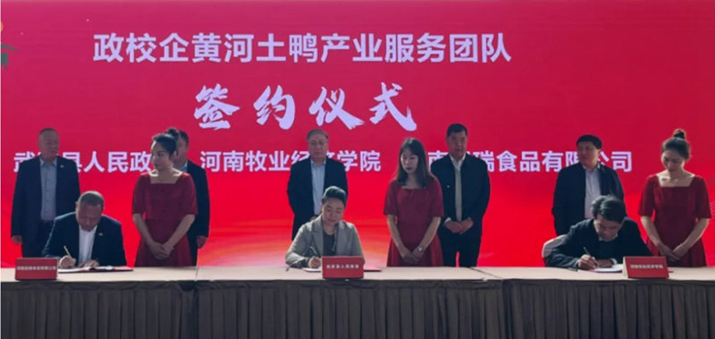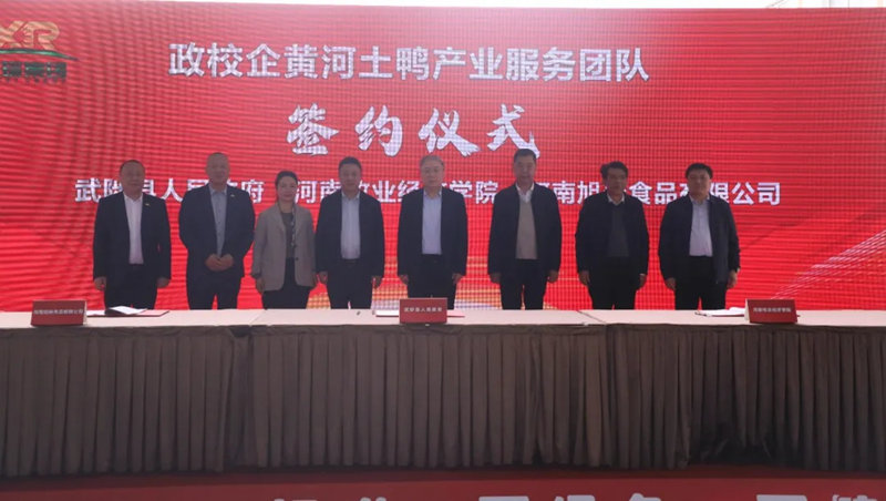武陟縣政府副縣長蘇瑞君、河南牧業(yè)經(jīng)濟學(xué)院副校長楊國宇、河南旭瑞食品有限公司副總經(jīng)理邱國平為政校企三方共建“黃河土鴨”產(chǎn)業(yè)服務(wù)團隊簽約。三方將共同構(gòu)建“政府+產(chǎn)業(yè)服務(wù)團隊+龍頭企業(yè)”服務(wù)合作模式,推動產(chǎn)科教融合發(fā)展。同時,河南牧業(yè)經(jīng)濟學(xué)院將授予我們“百名專家助百村(企)工程服務(wù)基地”和“博士工作站”兩塊響亮的牌子,由12名專業(yè)博士為集團提供的技術(shù)創(chuàng)新支持。